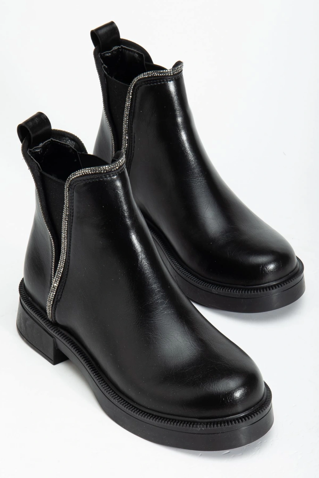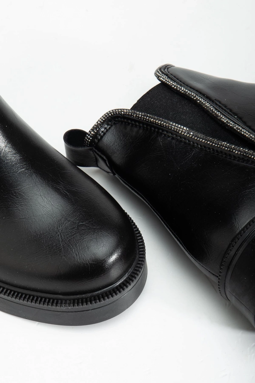 02-02 Siyah Kırışık Rugan Taş Aksesuarlı Lastikli Günlük Kadın Bot