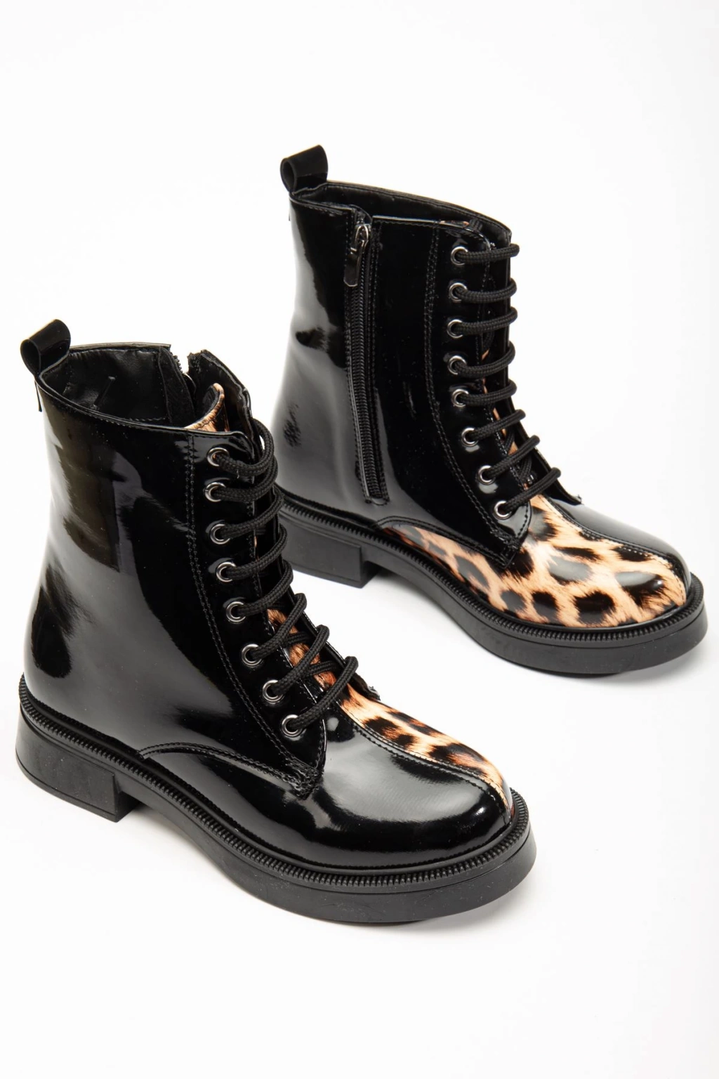 02-3055 Siyah Rugan Leopar Bağcıklı Fermuarlı Günlük Kadın Bot