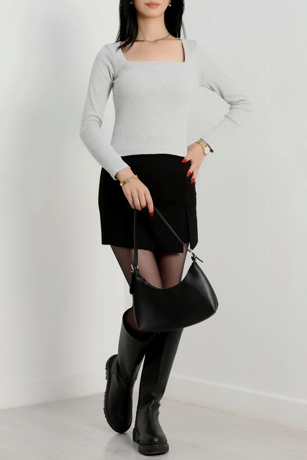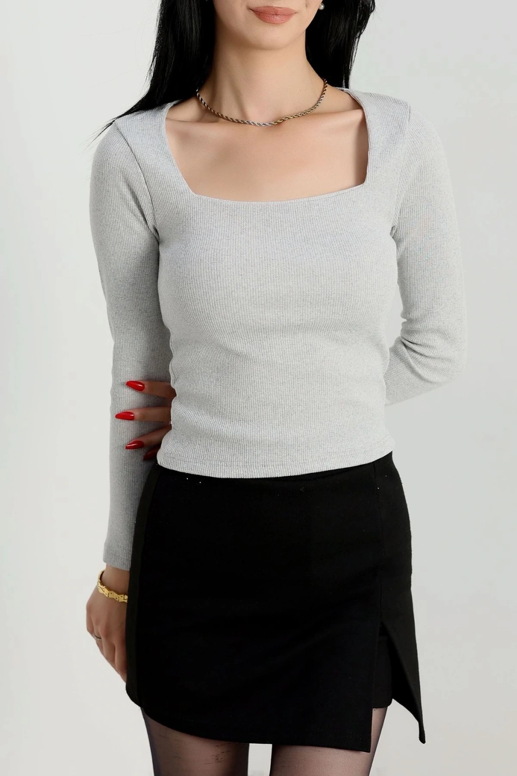 Çerçeve yaka kaşkorse bluz gri, şıklığı ve rahatlığı bir arada sunar.