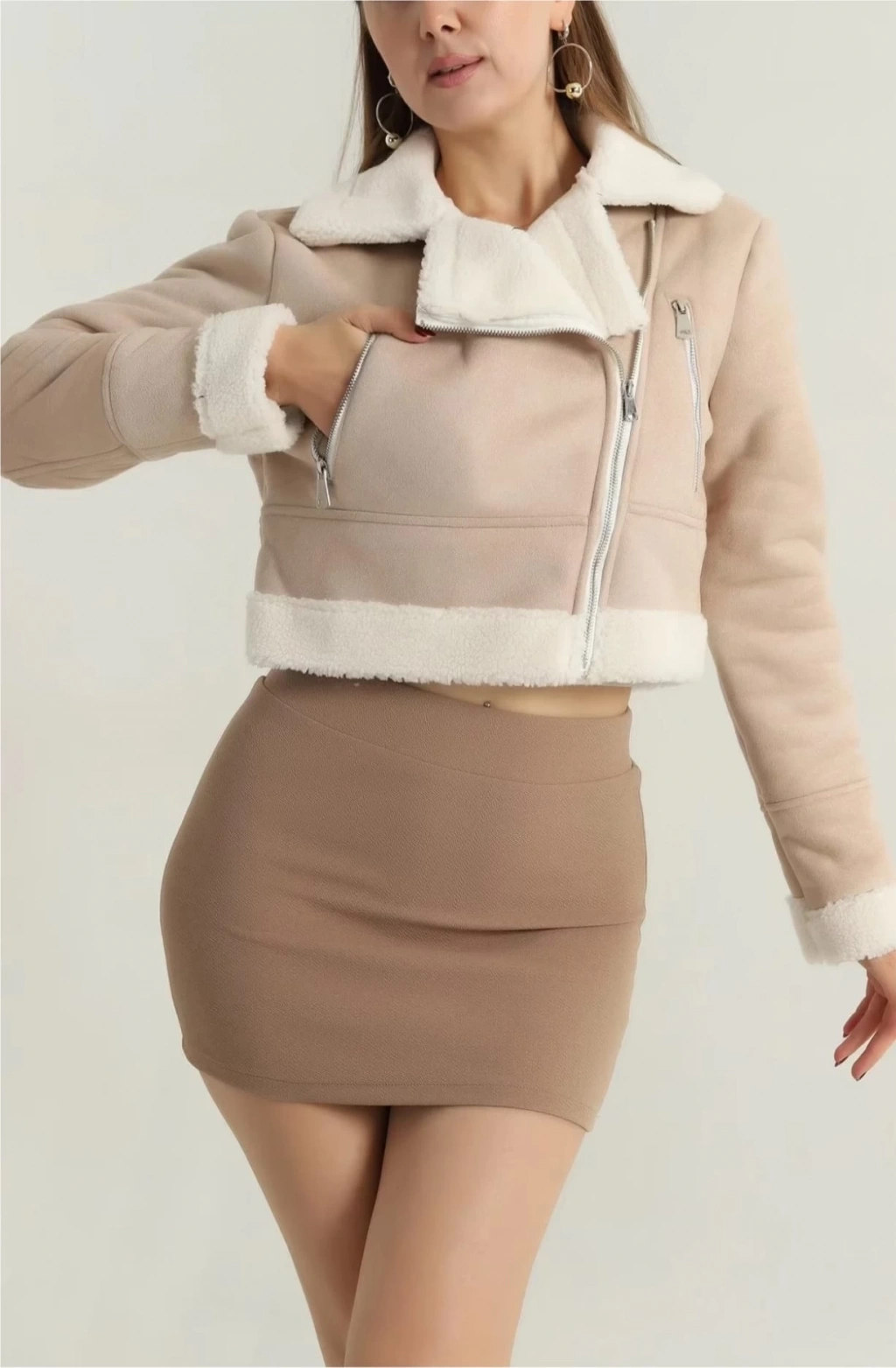 Ürün Adı: İçi Kürklü Dışı Süet Kısa Kaban Krem T1186